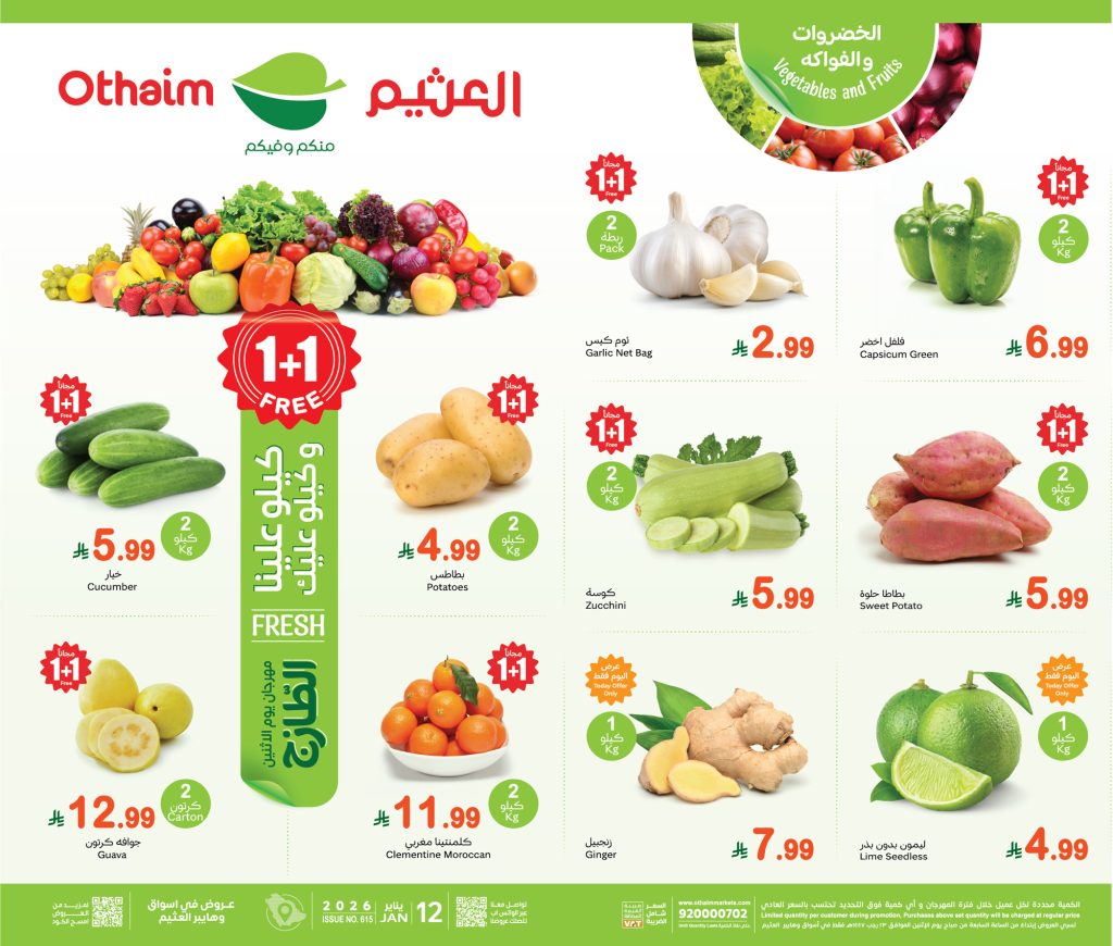 عروض العثيم الخضار الاثنين 12 يناير 2026 _ 23 رجب 1447 كيلو عليك وكيلو علينا + العروض الاسبوعية كل اللي تحتاجه لشهر الخير بأقل الأسعار تبدأ سنة جديدة مليئة بالفرص… وفرص التوفير هذه المرة أكبر من أي وقت مضى!